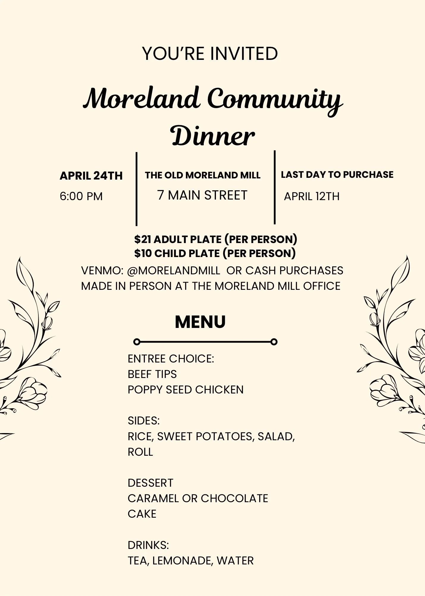 Join your neighbors and invite your friends for an evening of great food, connection, and community at the Moreland Community Dinner! This is a wonderful chance to gather with familiar faces and meet new ones while enjoying a delicious meal together.
